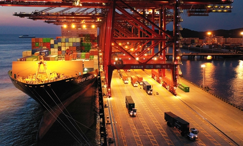 A container vessel offloads its cargo at Ningbo Zhoushan Port in East China's Zhejiang Province. Photo: cnsphoto