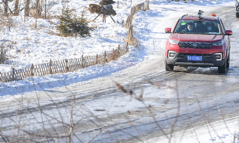 A contestant car is seen on the race track during an international autonomous car ice and snow driving challenge in Changchun City, capital of northeast China's Jilin Province, Jan. 14, 2021. The three-day event, which was designed to test the adaptability and durability of autonomous cars in ice and snow circumstances, concluded Thursday at the Lianhuashan Eco-tourism Resort in Changchun.Photo:Xinhua