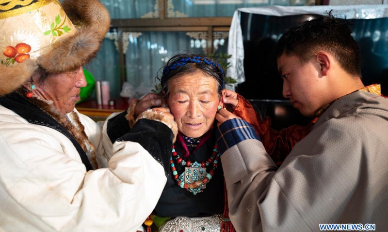 Villager Butri (C) has her earrings on in her new house to celebrate farmers' New Year in Gajilin Village of Chaqiug Township in Sa'gya County of Xigaze, southwest China's Tibet Autonomous Region, Jan. 14, 2021.Photo:Xinhua