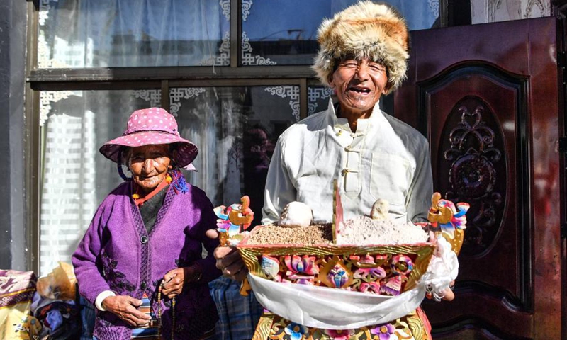 A villager relocated from poverty-stricken area welcomes guests with the "Qiema," a two-tier rectangular wooden box containing roasted barley and fried wheat grain, to celebrate farmers' New Year in his new house in Gajilin Village of Chaqiug Township in Sa'gya County of Xigaze, southwest China's Tibet Autonomous Region, Jan. 14, 2021.Photo:Xinhua