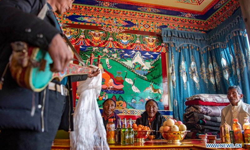 A villager relocated from poverty-stricken area plays six-string guitar to celebrate farmers' New Year in his new house in Gajilin Village of Chaqiug Township in Sa'gya County of Xigaze, southwest China's Tibet Autonomous Region, Jan. 14, 2021. Photo:Xinhua