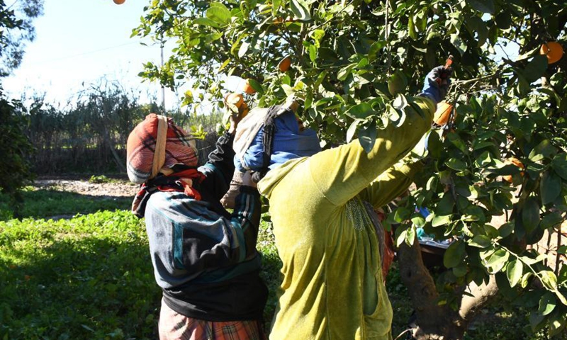 Workers collect oranges at a farm in Meknes, Morocco, Jan. 14, 2021. (Photo by Chadi/Xinhua)