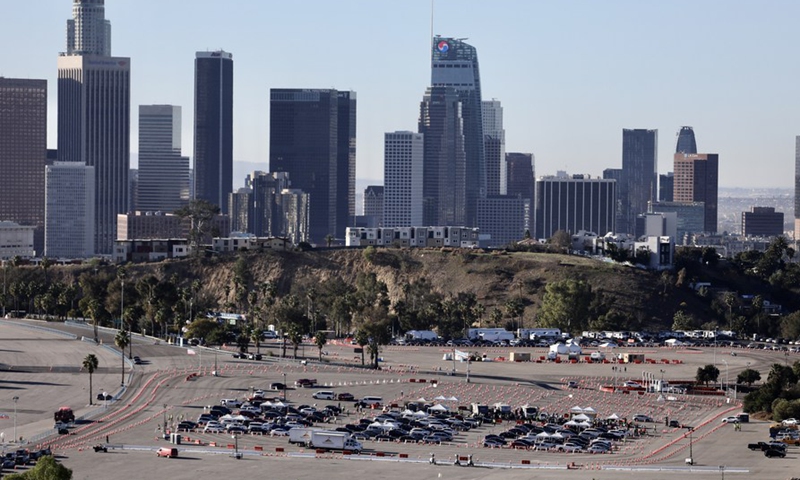 Motorists line up to receive inoculation at a COVID-19 vaccination site at Dodger Stadium in Los Angeles, California, the United States, Jan. 15, 2021. (Xinhua)