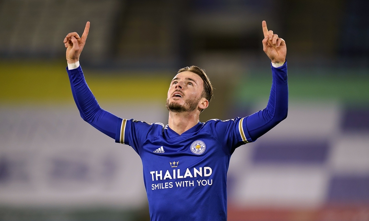 Leicester City's James Maddison celebrates scoring against Southampton on Saturday in Leicester, England. Photo: VCG