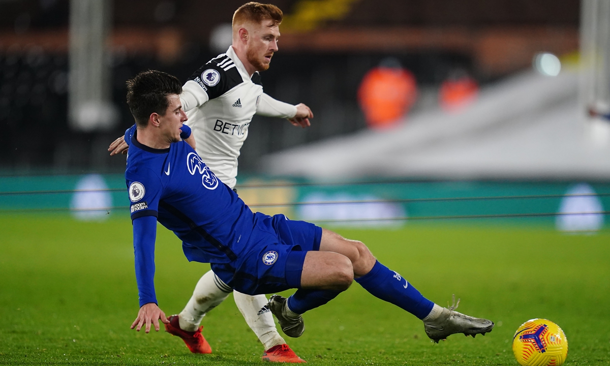 Chelsea's Mason Mount (left) and Fulham's Harrison Reed battle for the ball on Saturday in London, England. Photo: VCG