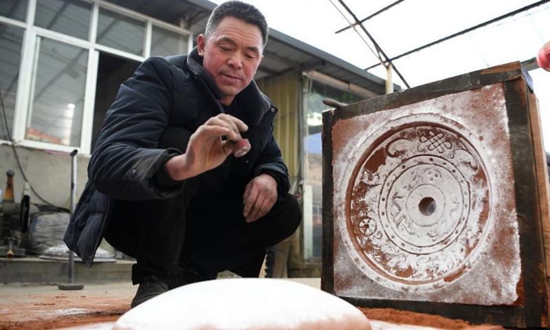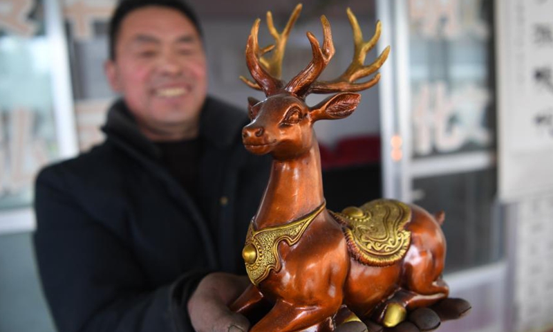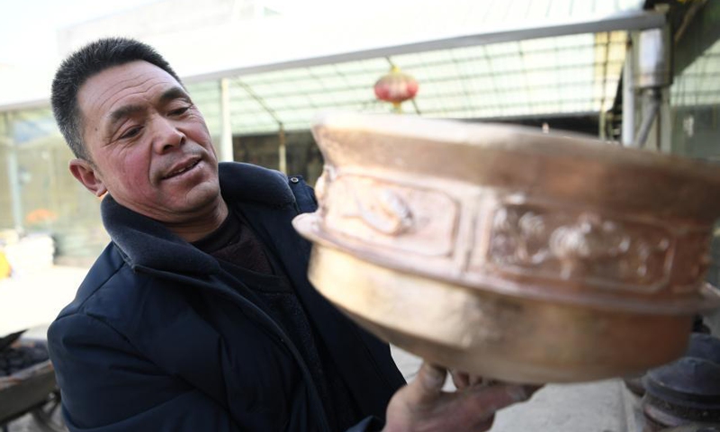 Representative inheritor of copper and aluminum casting technique Jiang Shengping displays a copper product at Qingshui Village of Minxian County, northwest China's Gansu Province, Jan. 16, 2021. The copper and aluminum casting technique with a history of hundreds of years in Minxian County is a provincial intangible cultural heritage in Gansu Province which requires more than ten processes including mold making, carving, casting and sand cleaning.