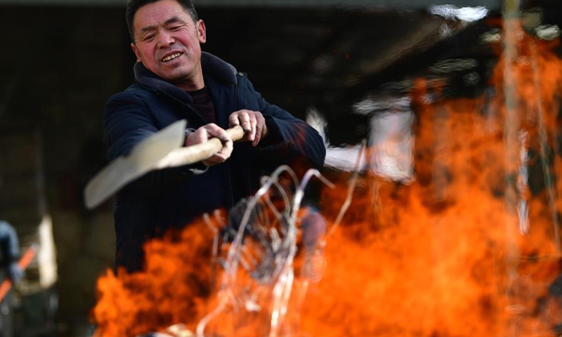 Representative inheritor of copper and aluminum casting technique Jiang Shengping melts copper material at Qingshui Village of Minxian County, northwest China's Gansu Province, Jan. 16, 2021. The copper and aluminum casting technique with a history of hundreds of years in Minxian County is a provincial intangible cultural heritage in Gansu Province which requires more than ten processes including mold making, carving, casting and sand cleaning.