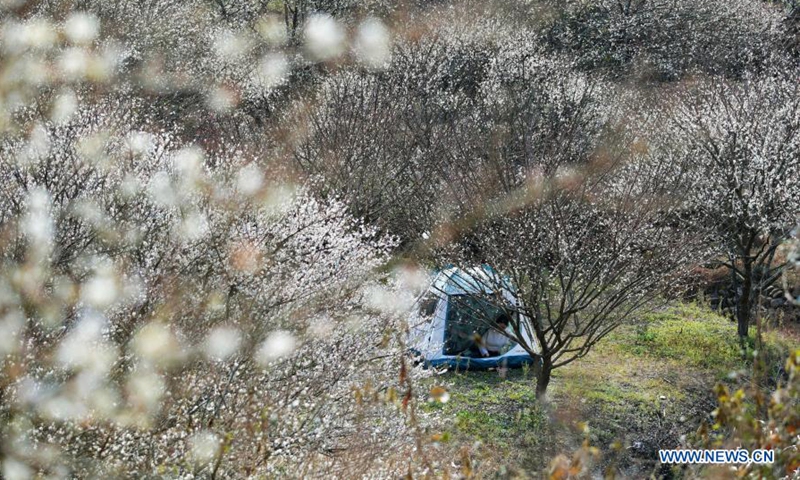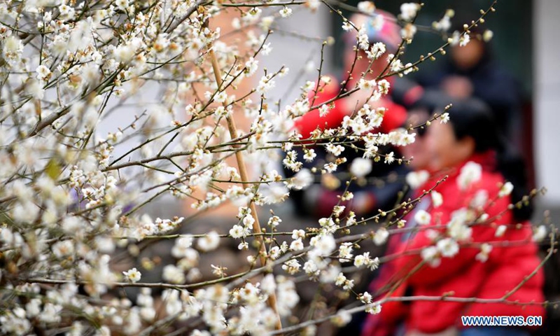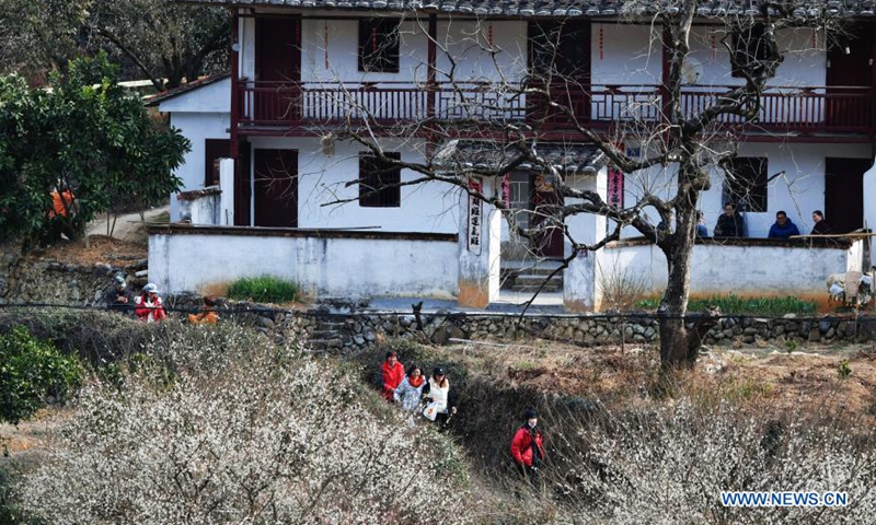 Visitors enjoy their leisure time among plum blossom in Yongtai County of Fuzhou, southeast China's Fujian Province, Jan. 17, 2021. (Xinhua/Wei Peiquan)