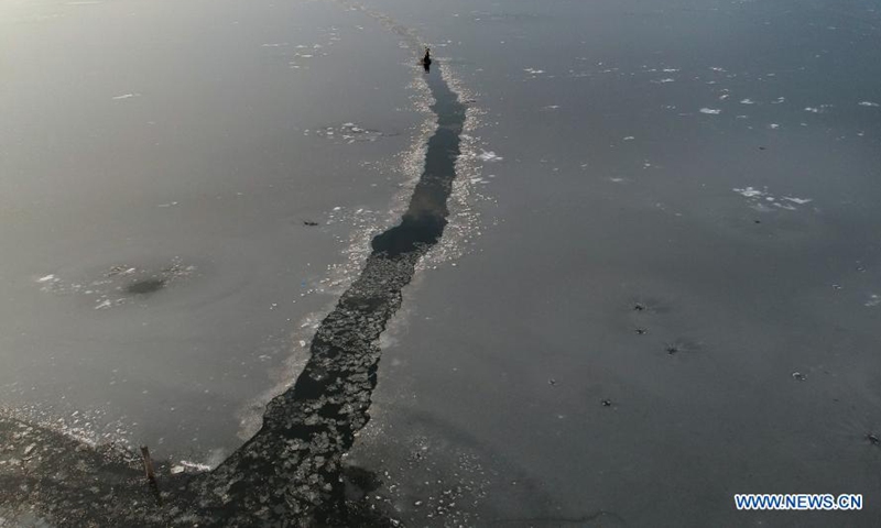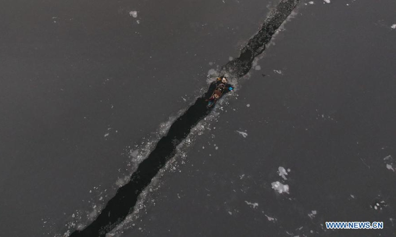 Boatmen make their way through the frozen surface of Dal lake in Srinagar, the summer capital of Indian-controlled Kashmir, Jan. 17, 2021. (Xinhua/Javed Dar)