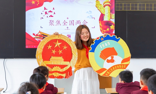 A teacher from the Chengnan Experimental Primary School in Hai'an, East China's Jiangsu Province, holds the Chinese National Emblem and the logo of the Chinese People's Political Consultative Conference to popularize knowledge of the annual two sessions in class. This year's Fourth Plenary Session of the 13th National People's Congress (NPC) and Chinese People's Political Consultative Conference (CPPCC), the most important annual political event in China, are collectively known as the two sessions. Photo: cnsphoto