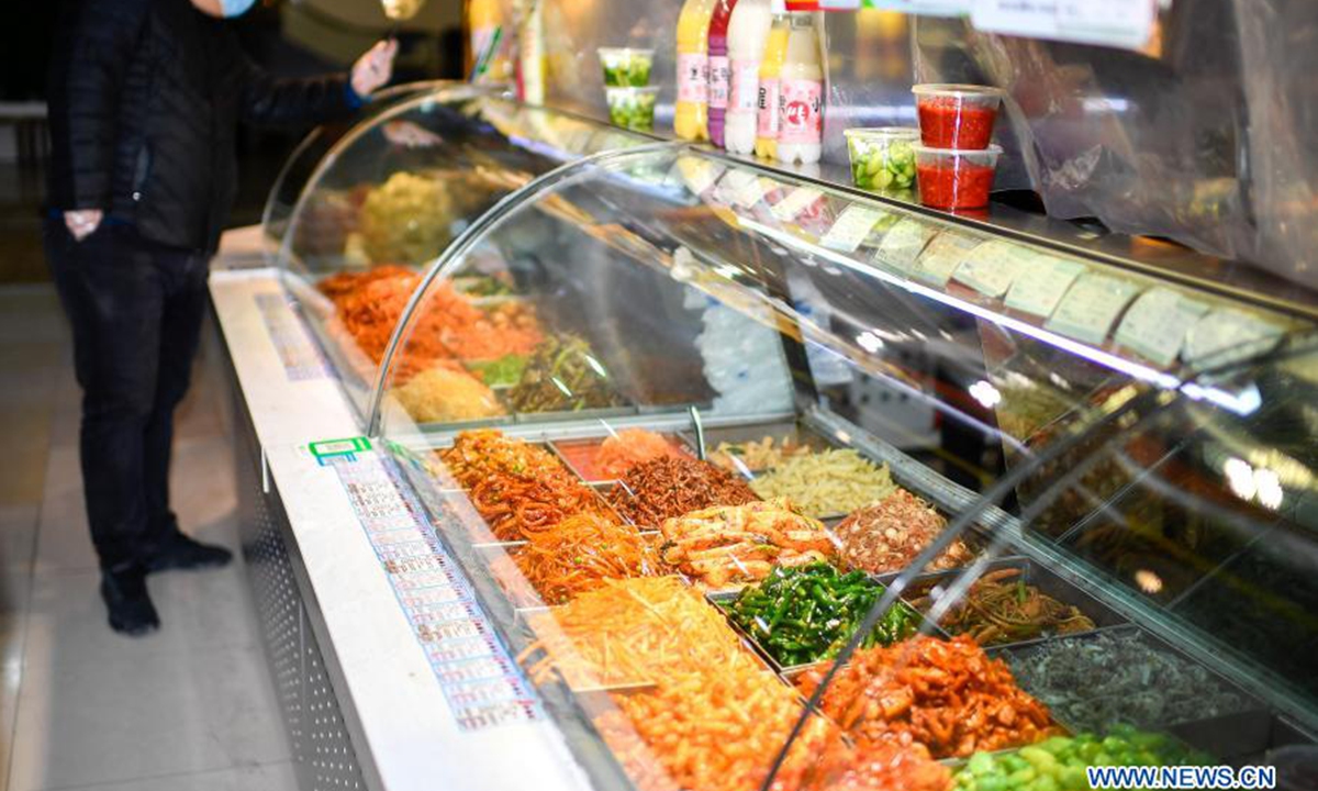 A customer buys delicatessen at a supermarket in Tonghua, northeast China's Jilin Province, Jan. 18, 2021. Local authorities have been paying attention to the supply of food in efforts to prevent and control COVID-19. (Xinhua/Xu Chang)