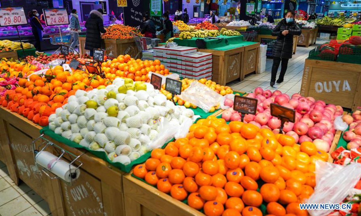 Customers buy fruits at a supermarket in Tonghua, northeast China's Jilin Province, Jan. 18, 2021. Local authorities have been paying attention to the supply of food in efforts to prevent and control COVID-19. (Xinhua/Xu Chang)