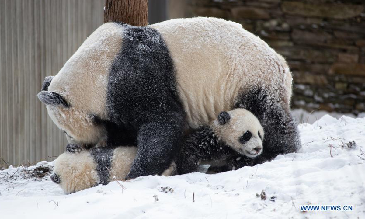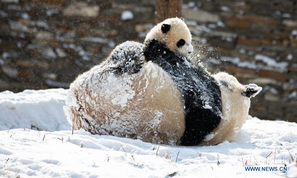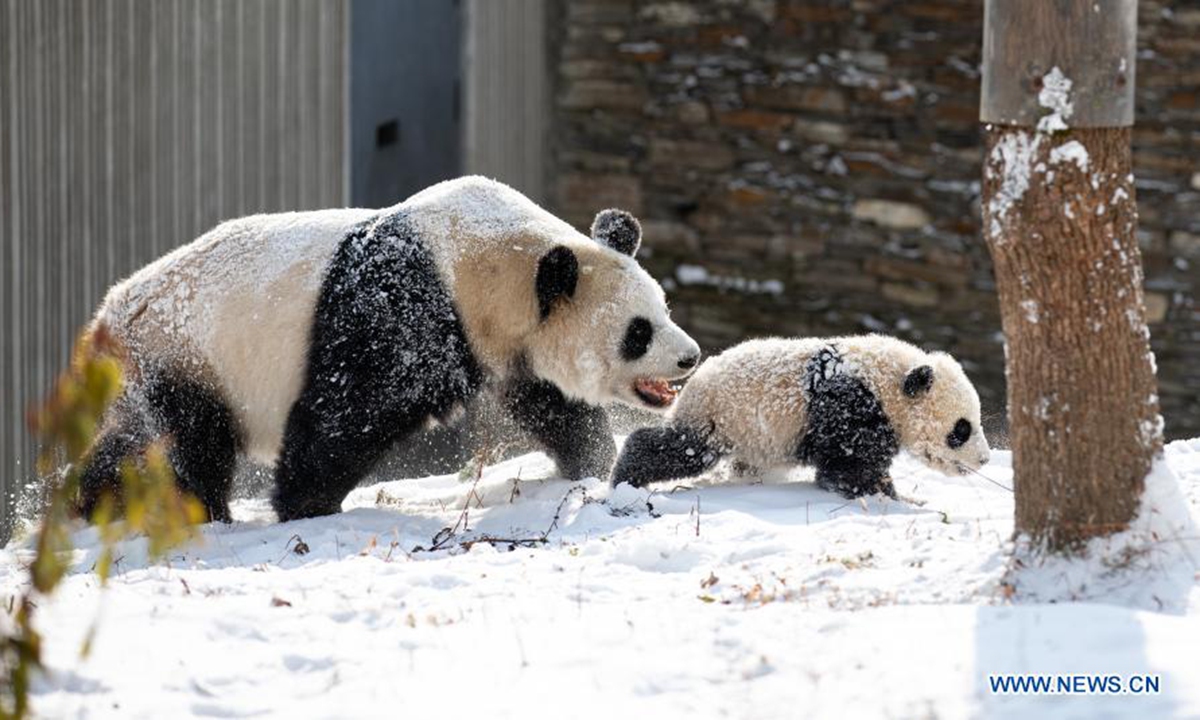 Giant panda Qianqian plays with one of her cubs at Shenshuping base of China Conservation and Research Center for Giant Pandas in Wolong National Nature Reserve, southwest China's Sichuan Province, Jan. 17, 2021. (Xinhua/Jiang Hongjing)