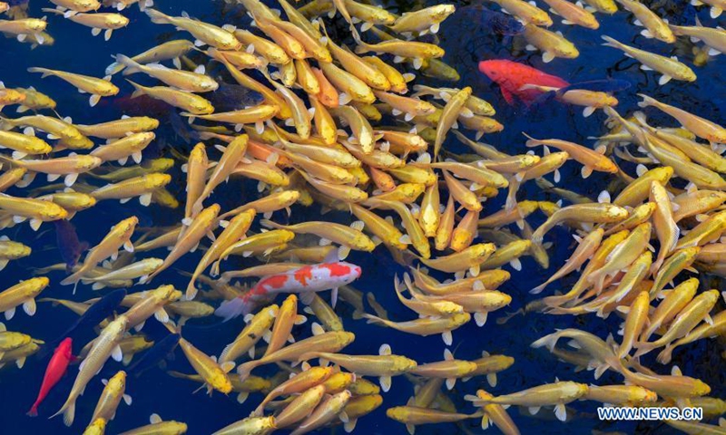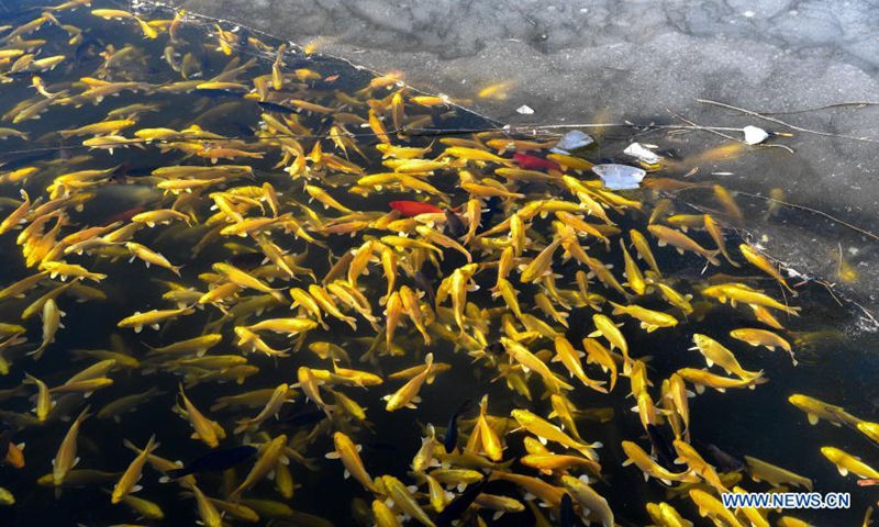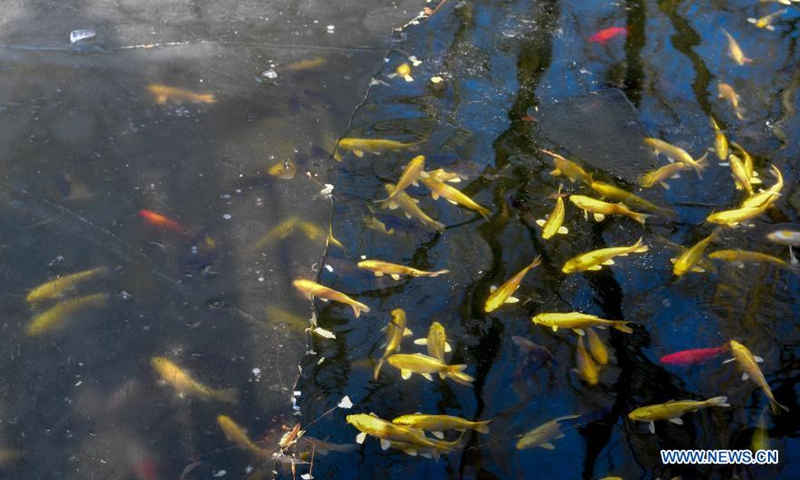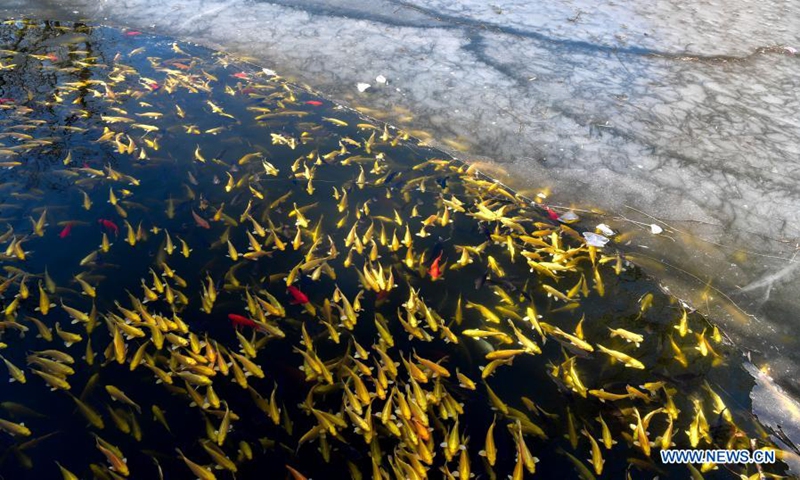 A shoal of koi carp swarm a half-frozen lake in Yuanmingyuan, or the Old Summer Palace, in Beijing, capital of China, Jan. 18, 2021. (Xinhua/Yin Dongxun)