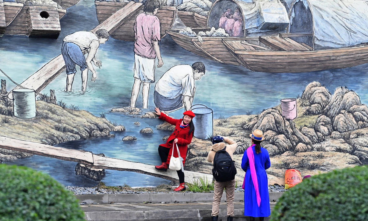 Passersby take photos against a giant graffiti wall in Southwest China's Chongqing Municipality which features natural scenes and folk cultures from ancient China. The combination of old and new has attracted many local residents. Photo: IC