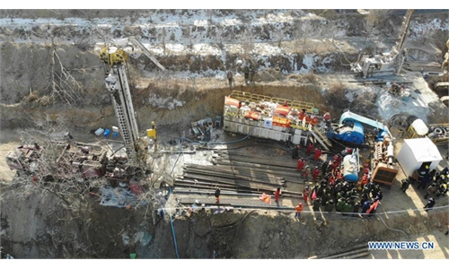 The Global Times reporter saw the rescuers divided into two groups for two shifts to ensure that the rescue work does not stop. Rescue workers are speeding up drilling operations while clearing obstacles at the site of the goldmine explosion despite complex geological conditions.