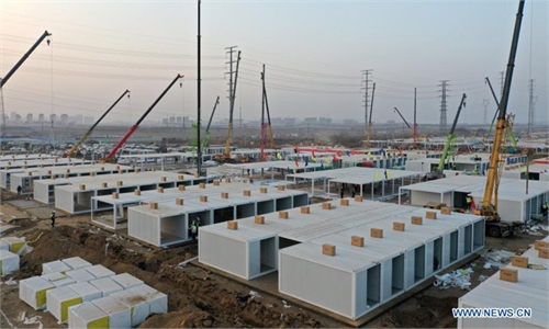 Workers work at the construction site of a centralized medical observation center in Shijiazhuang, capital of north China's Hebei Province, Jan. 16, 2021. (Xinhua/Jin Liangkuai)