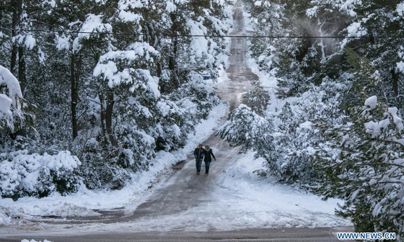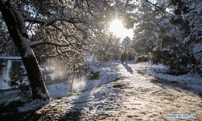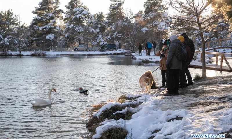 People walk in the snow by the Lake Beletsi in Athens, Greece, Jan. 17, 2021.Photo:Xinhua