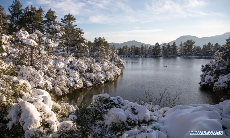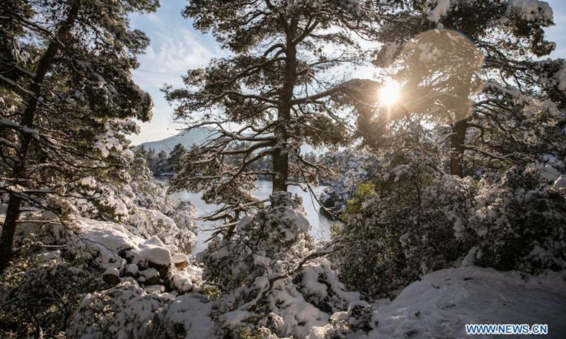 Photo taken on Jan. 17, 2021 shows the snow scenery of Lake Beletst in Athens, Greece.Photo:Xinhua