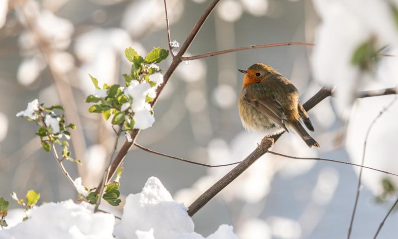 A bird stands on a branch by the Lake Beletsi in Athens, Greece, Jan. 17, 2021.Photo:Xinhua