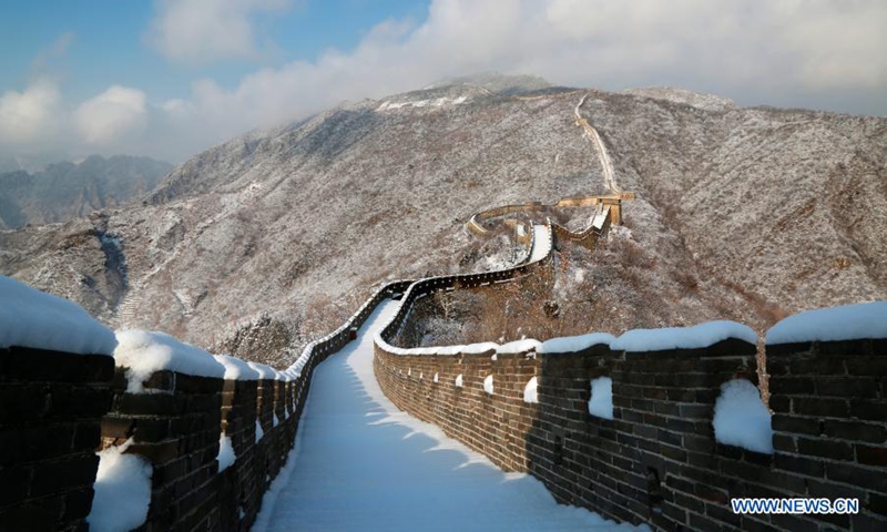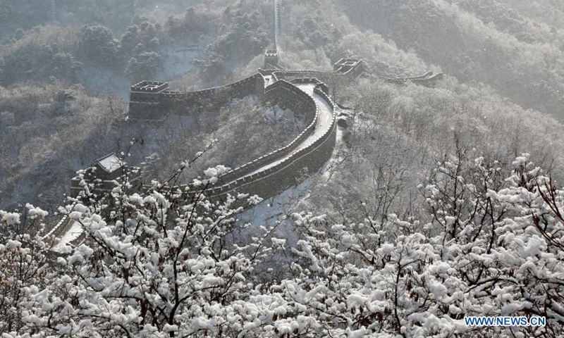 Photo taken on Jan. 19, 2021 shows a snow-covered Mutianyu section of the Great Wall in Huairou District, Beijing, capital of China. (Photo by Bu Xiangdong/Xinhua)
