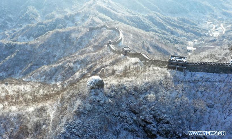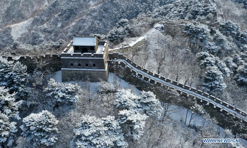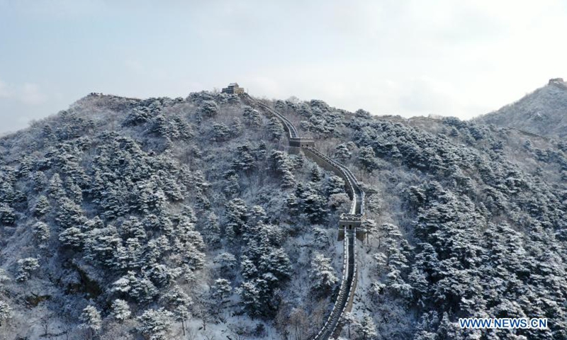 Aerial photo taken on Jan. 19, 2021 shows a snow-covered Mutianyu section of the Great Wall in Huairou District, Beijing, capital of China. (Photo by Bu Xiangdong/Xinhua)
