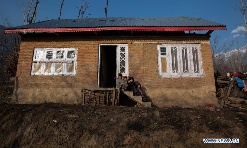 Children sit outside a house at a village in Anantnag district, south of Srinagar city, the summer capital of Indian-controlled Kashmir, Jan. 19, 2021. (Xinhua/Javed Dar)