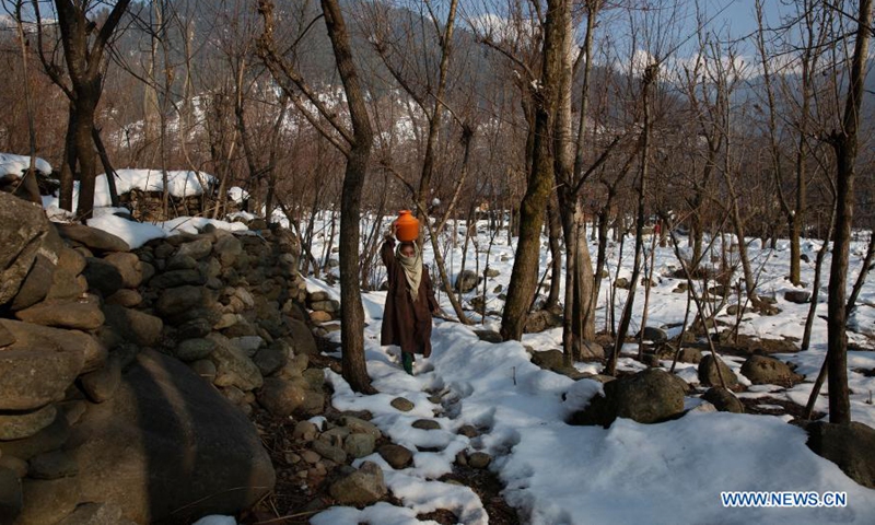 A woman carries a jar containing drinking water at a village in Anantnag district, south of Srinagar city, the summer capital of Indian-controlled Kashmir, Jan. 19, 2021. (Xinhua/Javed Dar)