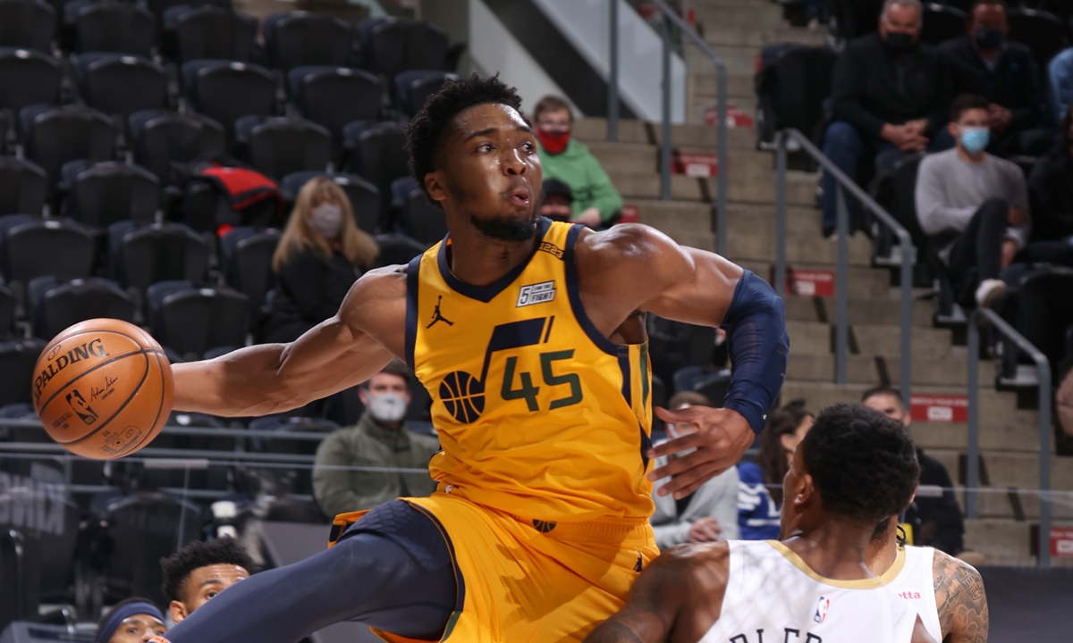 Donovan Mitchell of the Utah Jazz passes the ball during the game against the New Orleans Pelicans on Tuesday in Salt Lake City, Utah. Photo: AFP