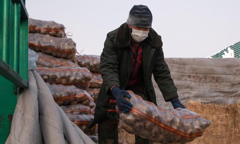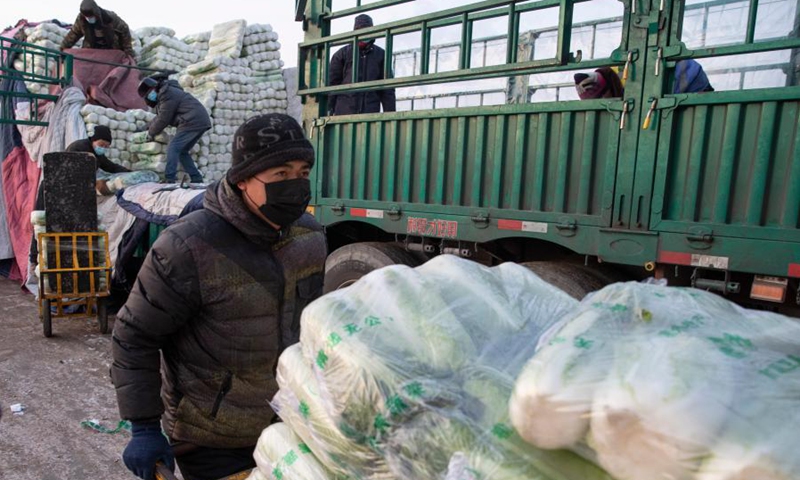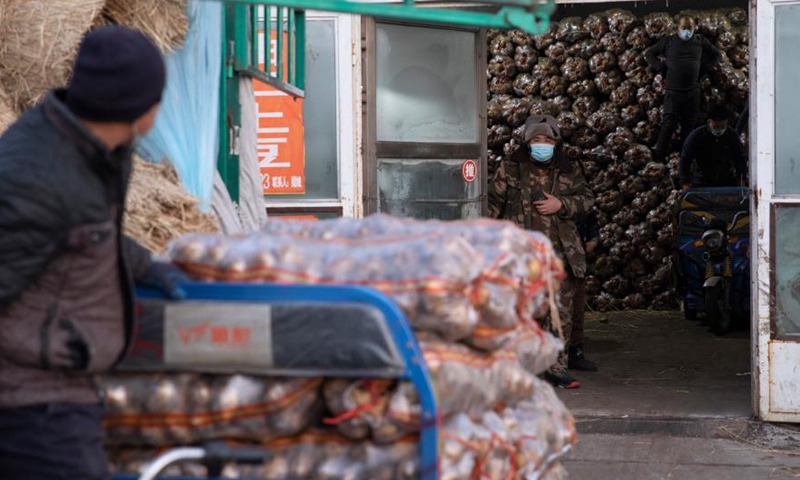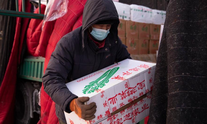 A worker carries vegetables at the Qingda Agricultural Products Wholesale Market in Suihua City, northeast China's Heilongjiang Province, Jan. 20, 2021. Beilin District in Suihua City has carried out strict restrictive measures following a COVID-19 outbreak in the city. In order to ensure the supply of fruits and vegetables in the whole city, Suihua Qingda Agricultural Products Wholesale Market has formulated a strict management process with the daily stocking volume reaching about 350 tonnes. (Photo by Zhang Tao/Xinhua)