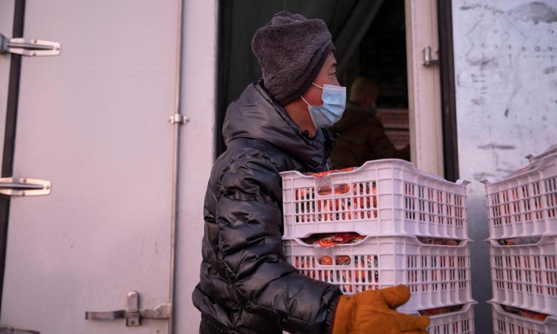 A worker carries fruits at the Qingda Agricultural Products Wholesale Market in Suihua City, northeast China's Heilongjiang Province, Jan. 20, 2021. Beilin District in Suihua City has carried out strict restrictive measures following a COVID-19 outbreak in the city. In order to ensure the supply of fruits and vegetables in the whole city, Suihua Qingda Agricultural Products Wholesale Market has formulated a strict management process with the daily stocking volume reaching about 350 tonnes. (Photo by Zhang Tao/Xinhua)