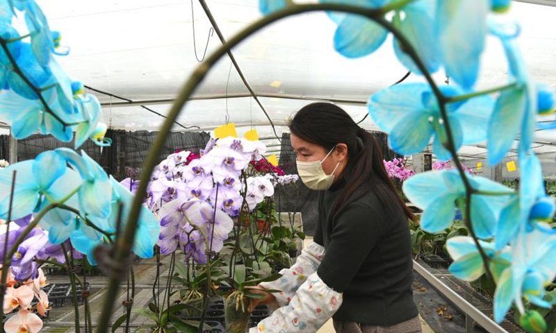 A worker arranges moth orchids to be sold at a greenhouse in Lianyungang City, east China's Jiangsu Province, Jan. 21, 2021. As the Spring Festival approaches, fresh flowers across China greet hot sales season. (Photo by Geng Yuhe/Xinhua)