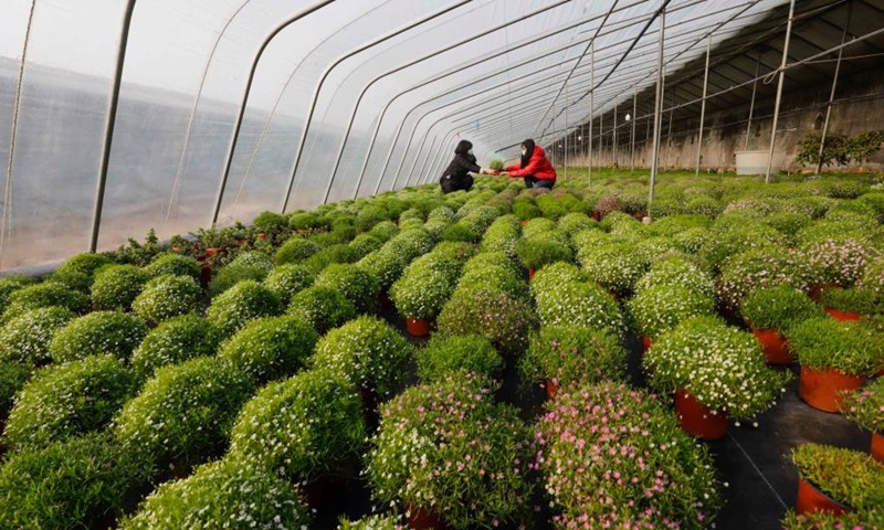 Farmers arrange flowers to be sold at a greenhouse at Guanshankou Village, Tangshan City of north China's Hebei Province, Jan. 21, 2021. As the Spring Festival approaches, fresh flowers across China greet hot sales season. (Photo by Liu Mancang/Xinhua)