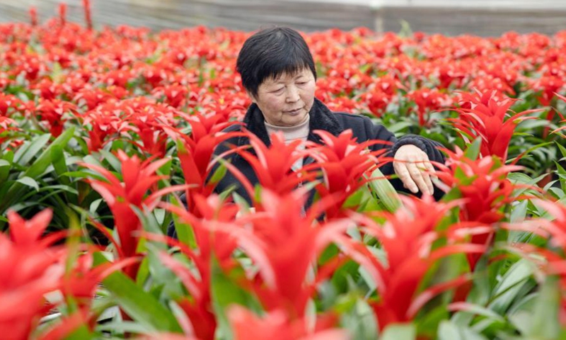 A worker arranges bromeliads at an agricultural ecological garden in Taizhou City, east China's Jiangsu Province, Jan. 21, 2021. As the Spring Festival approaches, fresh flowers across China greet hot sales season. (Photo by Gu Jihong/Xinhua)