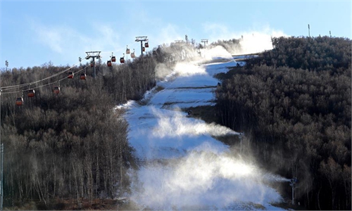 Snowmaking machines work at a ski field in Chongli District of Zhangjiakou City, north China's Hebei Province, Oct. ...