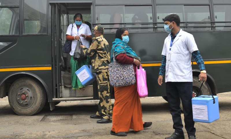 Health workers arrive at a hospital to give doses of the COVID-19 vaccine Covishield to health workers of the Border Security Force at Agartala, the capital city of India's northeastern state of Tripura, Jan. 21, 2021.Photo:Xinhua