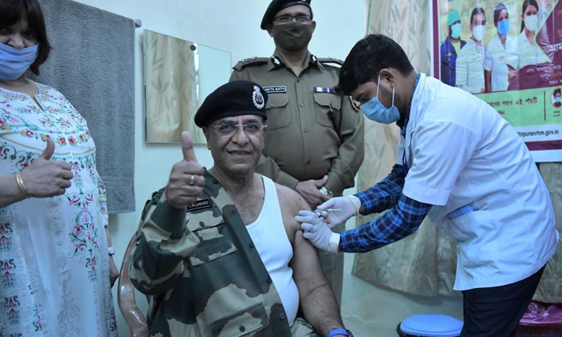 A health worker of the Border Security Force receives a dose of the COVID-19 vaccine Covishield at Agartala, the capital city of India's northeastern state of Tripura, Jan. 21, 2021.Photo:Xinhua