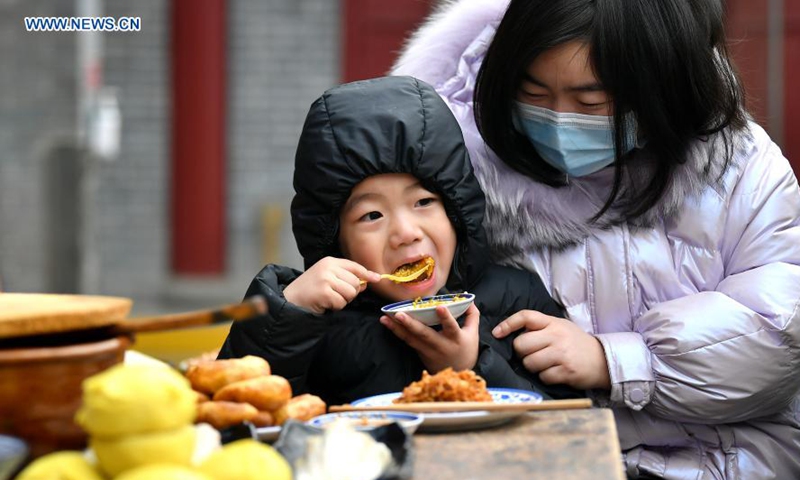 A boy eats Laba snacks at Yongxingfang community in Xi'an, northwest China's Shaanxi Province, Jan. 20, 2021. The Laba Festival, literally the eighth day of the 12th lunar month, is considered a prelude to the Spring Festival, or Chinese Lunar New Year. (Xinhua/Liu Xiao)