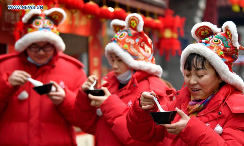 Staff members of Yongxingfang community eat Laba porridge in Xi'an, northwest China's Shaanxi Province, Jan. 20, 2021. The Laba Festival, literally the eighth day of the 12th lunar month, is considered a prelude to the Spring Festival, or Chinese Lunar New Year. (Xinhua/Liu Xiao)