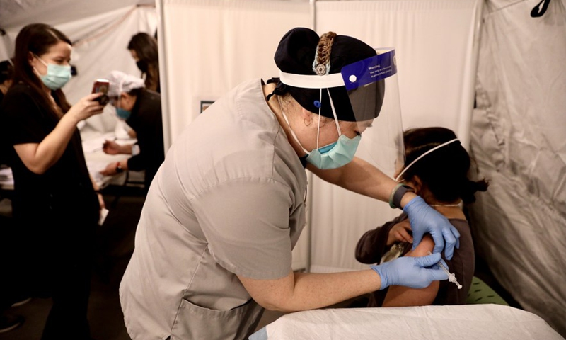 A frontline health care worker at Garfield Medical Center receives his first dose of Pfizer COVID-19 vaccine in a pop-up tent outside their main facility in Monterey Park, Los Angeles County, California, the United States, Dec. 18, 2020. (Xinhua)