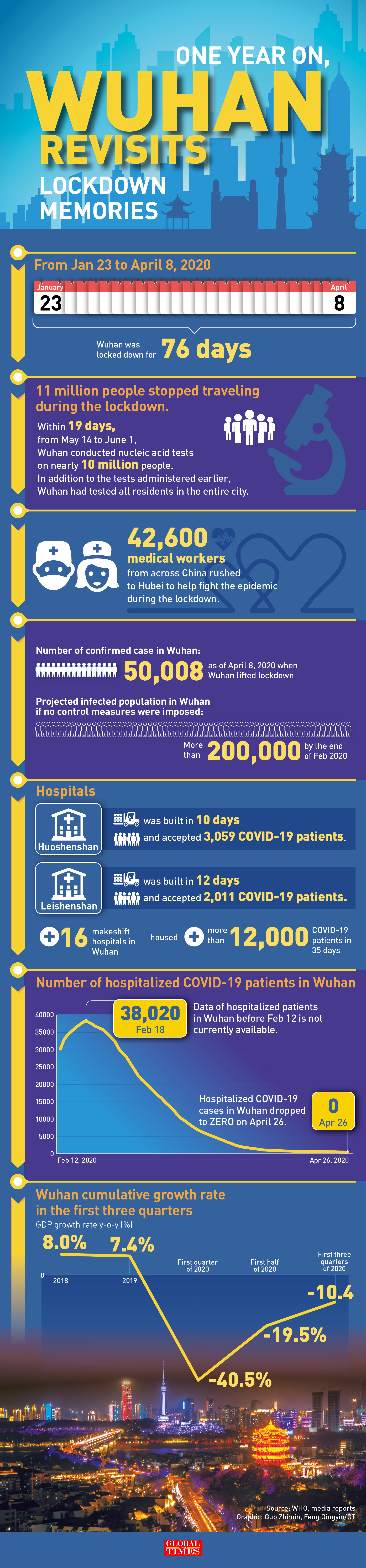 One year ago, Wuhan began its lockdown which ended up lasting for 76 days. During the lockdown, 11 million people stopped traveling and 42,600 medical workers arrived in Hubei to fight the epidemic. Graphic: Guo Zhimin, Feng Qingyin/GT