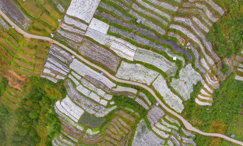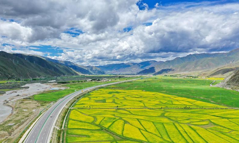 Aerial photo taken on Oct. 26, 2019 shows a road crossing a field in Medog County, southwest China's Tibet Autonomous Region. A rural highway and high-grade road network connecting towns and villages has been set up in Tibet. Strengthening the construction of rural transport infrastructure has changed people's life here. (Xinhua/Sun Fei)