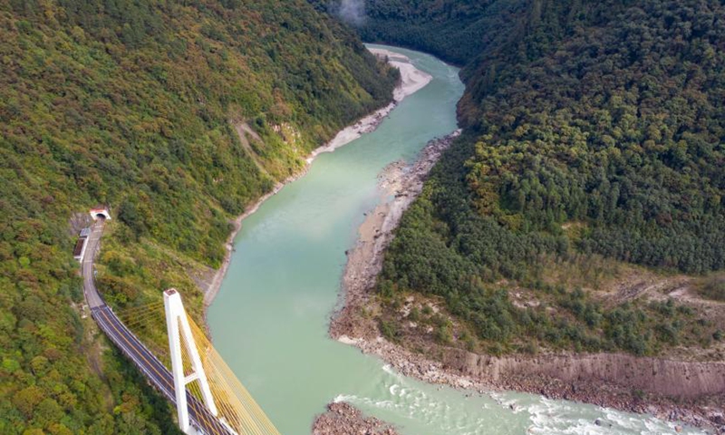 Aerial photo taken on Oct. 27, 2019 shows the Polonggou grand bridge in Bomi County, Nyingchi of southwest China's Tibet Autonomous Region. A rural highway and high-grade road network connecting towns and villages has been set up in Tibet. Strengthening the construction of rural transport infrastructure has changed people's life here. (Xinhua/Sun Fei)