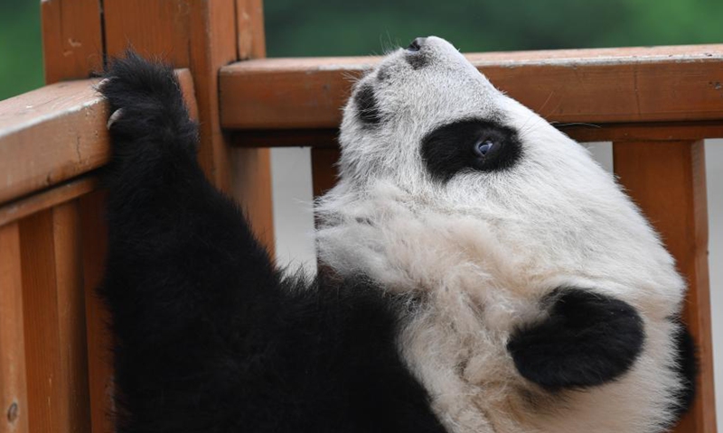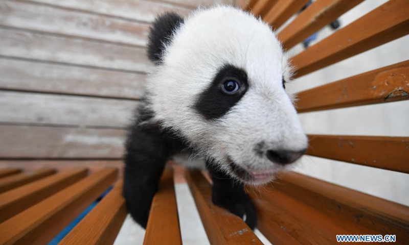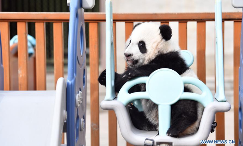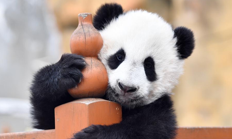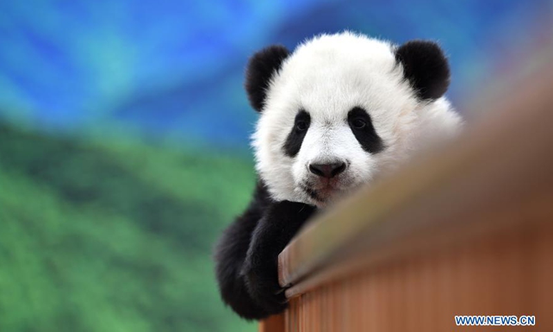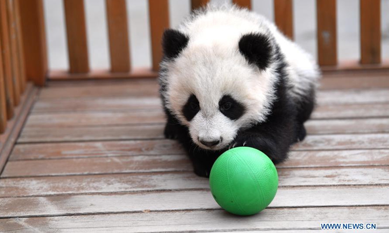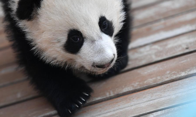 A giant panda cub plays at the Qinling breeding and research center for the giant panda in northwest China's Shaanxi Province, Jan. 22, 2021. Three giant pandas have given birth to 4 cubs here in 2020.Photo:Xinhua