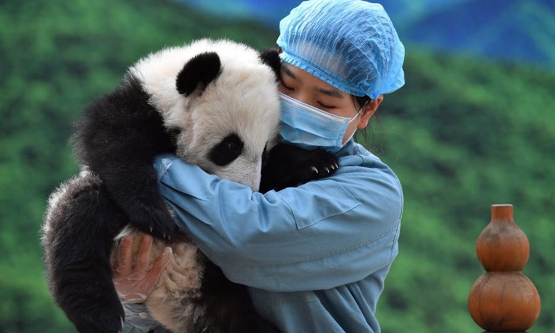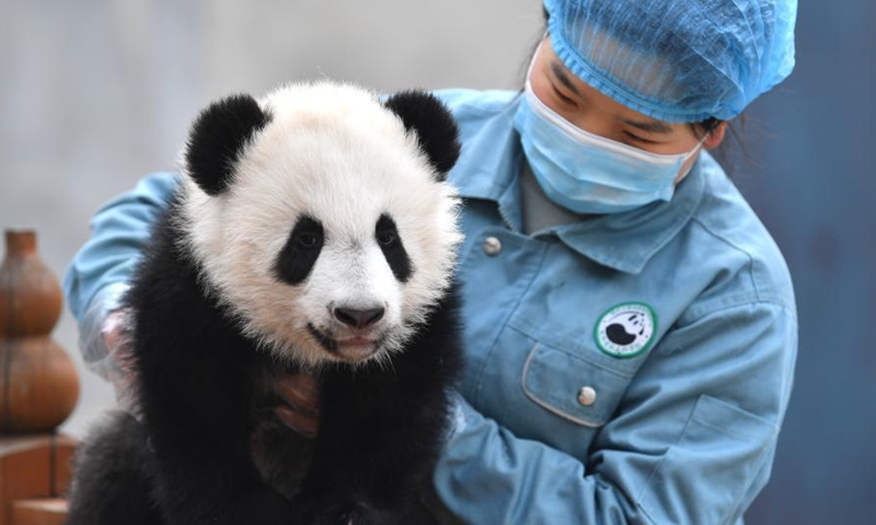 A keeper takes care of a giant panda cub at the Qinling breeding and research center for the giant panda in northwest China's Shaanxi Province, Jan. 22, 2021. Three giant pandas have given birth to 4 cubs here in 2020.Photo:Xinhua