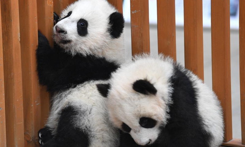Giant panda cubs play at the Qinling breeding and research center for the giant panda in northwest China's Shaanxi Province, Jan. 22, 2021. Three giant pandas have given birth to 4 cubs here in 2020.Photo:Xinhua