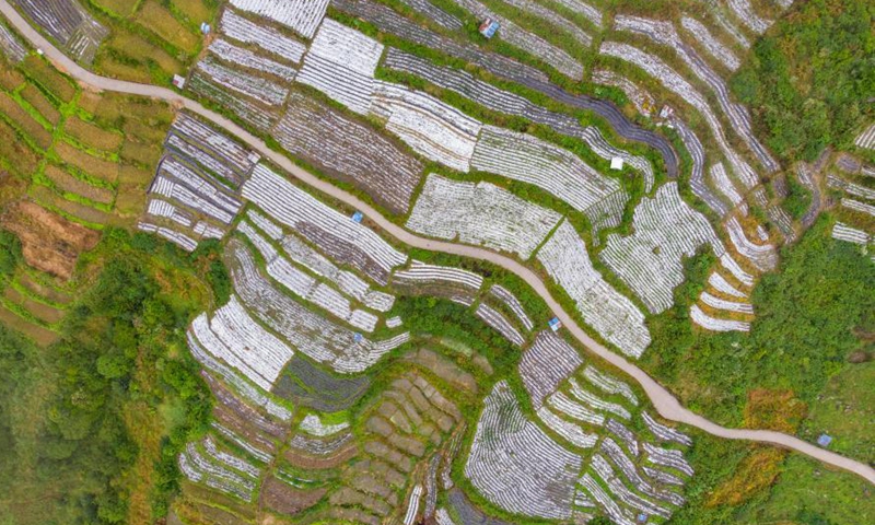 Aerial photo taken on Oct. 26, 2019 shows a road crossing a field in Medog County, southwest China's Tibet Autonomous Region. A rural highway and high-grade road network connecting towns and villages has been set up in Tibet. Strengthening the construction of rural transport infrastructure has changed people's life here.Photo:Xinhua