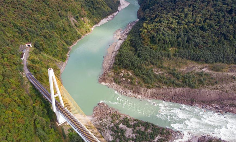 Aerial photo taken on Oct. 27, 2019 shows the Polonggou grand bridge in Bomi County, Nyingchi of southwest China's Tibet Autonomous Region. A rural highway and high-grade road network connecting towns and villages has been set up in Tibet. Strengthening the construction of rural transport infrastructure has changed people's life here.Photo:Xinhua