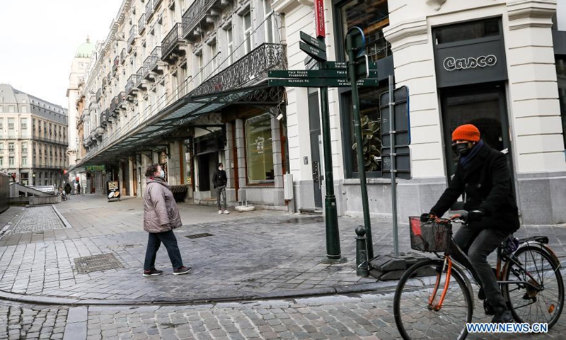 People walk on a street in downtown Brussels, Belgium, Jan. 22, 2021. Belgium will start to ban non-essential travel from or to the country starting on Jan. 27, Prime Minister Alexander De Croo announced Friday. The ban will be valid until March 1. Photo:Xinhua