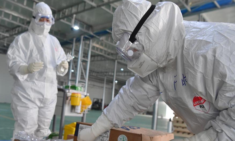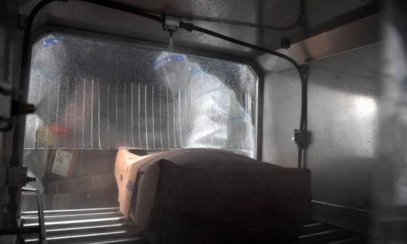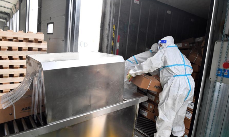 Staff members lie imported food on a disinfection machine at a supervised warehouse for imported cold chain food in Zhengzhou, central China's Henan Province, Jan. 22, 2021. Two supervised warehouses for imported cold chain food have been put into use in Zhengzhou on Jan. 20. All of the imported cold chain food entering Zhengzhou would be tested and disinfected here.Photo:Xinhua